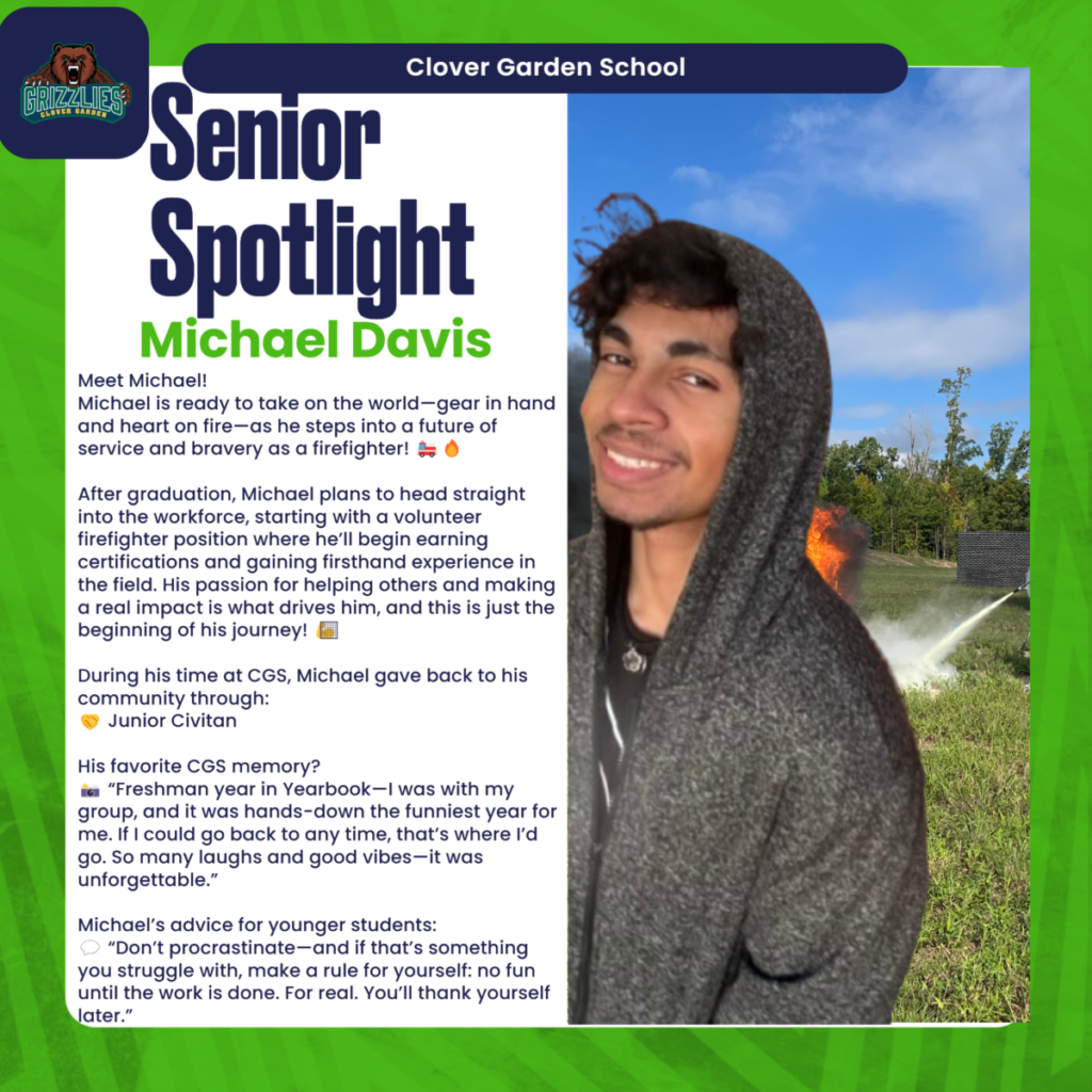 Let’s give a big shout out to Michael—future firefighter and all-around hero in the making. With a heart for service and a clear sense of purpose, Michael is heading straight into the workforce after graduation to begin his journey as a volunteer firefighter. He’s already working toward certifications and gaining hands-on experience, ready to serve his community with strength and courage.